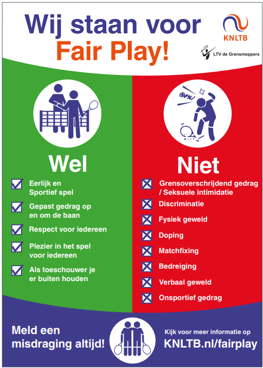 Bij LTV de Grensmeppers vinden we het belangrijk dat iedereen veilig en met plezier kan tennissen en padellen. Daarvoor hanteren we duidelijke gedragscodes en fair play regels. Samen zorgen we voor een sportieve, respectvolle en inclusieve vereniging.